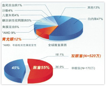 青光眼的主要危害是損害視神經(jīng),使患者出現(xiàn)視力下降、視野缺損,患者視線范圍內(nèi)出現(xiàn)盲區(qū),隨著病情的進(jìn)展,黑點(diǎn)范圍不斷擴(kuò)大,最終導(dǎo)致失明。青光眼是全球第2位致盲眼病,僅次于白內(nèi)障。一項(xiàng)國(guó)內(nèi)調(diào)查顯示,我國(guó)青光眼患者55%致盲,18.1%導(dǎo)致雙眼盲。