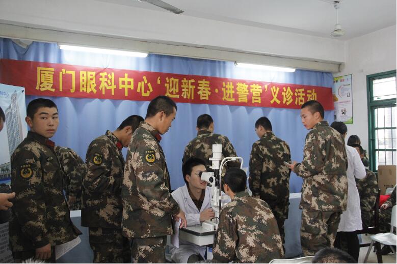 1月29日下午,廈門眼科中心眼表與角膜病專家一行9人冒著冬雨到翔安武警邊防支隊(duì)機(jī)動(dòng)大隊(duì),開展“迎新春 送健康”健康咨詢、義診活動(dòng),并為邊防支隊(duì)武警贈(zèng)送了進(jìn)口眼藥水。廈門眼科中心以實(shí)際行動(dòng)提前為武警邊防支隊(duì)致以新春祝福與問候,并送去了健康。義診現(xiàn)場氣氛十分熱烈,義診從下午三點(diǎn)半一直持續(xù)到下午六點(diǎn),為近百名武警做了眼體檢。