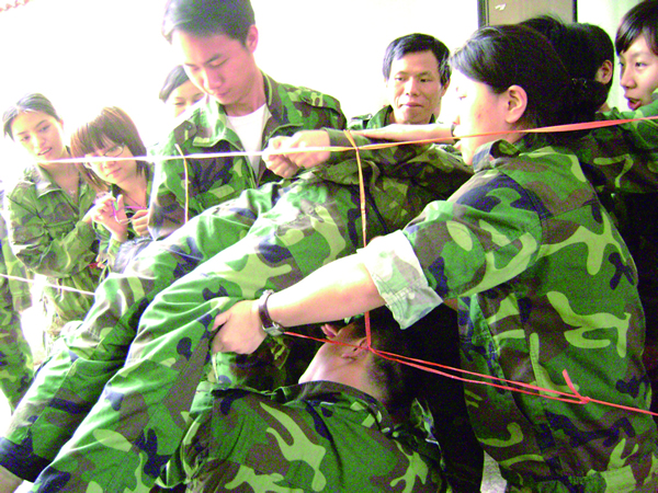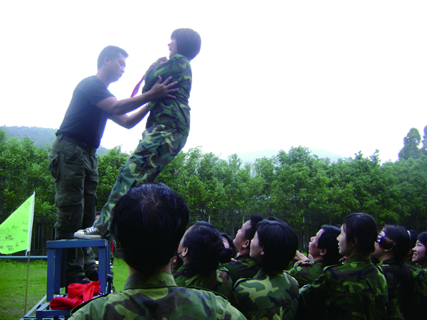 “相信大家,放心把你自己交給大家,你什么都不要想,大家會安全地把你接住”這是“信任背摔”項目的內涵所在。項目形式是一個人站在4米高的位置,手被紅領巾綁住,然后在隊友“我們準備好了,我們支持你,我們愛你”中從高空倒下,你的隊友們會用手臂把你安全接住,讓你感受團隊戰(zhàn)友的臂膀與赤誠。