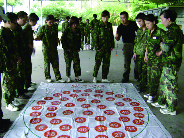 一張印有50個豪無規(guī)律數字的塑料毯,項目要求團隊在最快的時間里按1~50的順序踩數字,同時不能踩到毯子以及毯子上方不能同時出現兩只腳,否則要重新開始。在這項目中我們的“必勝莊園隊”認真思考,仔細研究塑料毯上看似無規(guī)律的數字其實也不是完全沒有規(guī)律的,上方的數字擺放比較稀疏,左右兩側和下方會相對密集。于是他們根據數字的規(guī)律調整人員分布,左右兩側和下方盡量多些人,大家手拉手互相扶持。果然,很有效率,輕輕松松地完成并以較短時間戰(zhàn)勝。而“勇者無敵隊”,由于沒有講究方法進行協條分工,是幾個人輪流踩數字,一直圍繞著毯子在跑與踩。幾輪下來,一個個滿頭大汗,也筋疲力盡,結果還是以戰(zhàn)敗告終。
