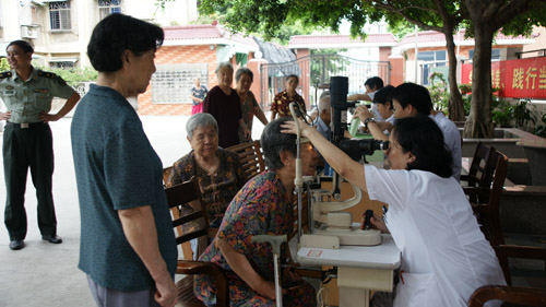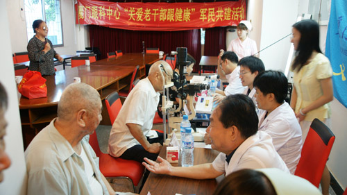 在干休所,眼科專家耐心細致地為每一位老干部作眼部檢查,向他們講解眼保健知識,進行診斷,并發(fā)放藥品。醫(yī)護人員則熱情地為老人們測量血壓、作視力檢查。為了幫助老人們掌握眼保健知識, 醫(yī)護人員還專門搜集了眼病常見問題及愛眼護眼保健知識等,印制成宣傳手冊發(fā)放給老人。