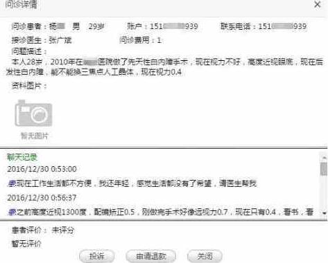 12月30日0:53,28歲的先天性白內(nèi)障患者小楊在眼科通APP上發(fā)出圖文咨詢:本人29歲,之前先天性白內(nèi)障,高度近視1300度,配鏡矯正視力0.5,2010年在某醫(yī)院做了手術(shù),剛做完時(shí)遠(yuǎn)視力0.7,現(xiàn)在后發(fā)性白內(nèi)障,視力只有0.4,看書、看電腦字小、光線不好無法識(shí)別,能不能換三焦點(diǎn)人工晶體,有沒有好的方案或建議?