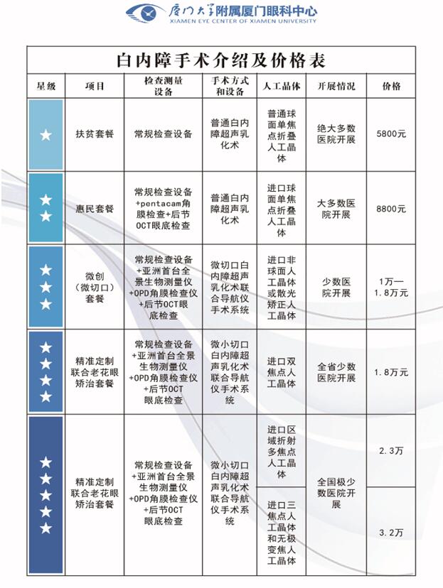 為最大程度滿足患者的個性化需求,眼科中心在原有套餐的基礎(chǔ)上,更加精細(xì)化,根據(jù)手術(shù)方式、人工晶體的品牌、材質(zhì)及手術(shù)耗品等不同,推出六大白內(nèi)障手術(shù)套餐價,使眼病患者享受指定服務(wù),放心就醫(yī),明白消費(fèi)。