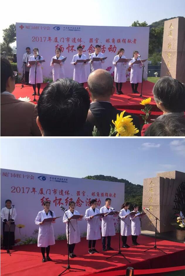 活動中,廈門大學(xué)附屬廈門眼科中心醫(yī)務(wù)工作者們帶來了《生命的禮物》的詩朗誦表演,表達(dá)了對捐獻(xiàn)者無償獻(xiàn)出珍貴“生命禮物”的崇敬與感恩之情。廈門大學(xué)醫(yī)學(xué)院青年志愿者協(xié)會在紀(jì)念碑前宣誓并遞上了獻(xiàn)花。捐獻(xiàn)者紀(jì)念碑前,手捧白菊的人群中,有蹣跚而行的白發(fā)老人,有一臉稚氣的年幼孩童,更多的是中年人和青年人。人群中,有人哭泣,有人默默佇立,一遍遍撫摸著刻在紀(jì)念碑上親人的名字。
