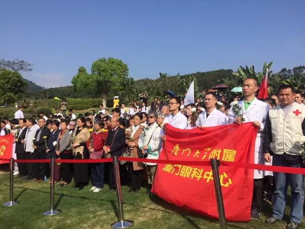 4月1日上午,廈門市紅十字會聯(lián)合廈門大學(xué)附屬廈門眼科中心在海滄文圃山陵園組織的2017年廈門市遺體與器官(組織)捐獻(xiàn)者緬懷紀(jì)念活動順利舉行。捐獻(xiàn)者家屬、捐獻(xiàn)志愿者代表,廈門市紅十字會黨組書記、常務(wù)副會長蘇蘇,廈門市紅十字會副會長兼秘書長俞娟,廈門市衛(wèi)計委醫(yī)政醫(yī)管處處長陳糧,廈門大學(xué)附屬廈門眼科中心黨委書記陳逸恬,以及廈門海滄文圃山陵園開發(fā)有限公司、廈門大學(xué)醫(yī)學(xué)院、廈門醫(yī)學(xué)院、廈門大學(xué)附屬廈門眼科中心以及各區(qū)紅十字會代表共300余人參加了活動。