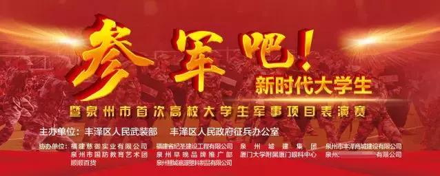 2019年5月25日,由泉州市豐澤區(qū)人民武裝部,豐澤區(qū)人民政府征兵辦公室主辦,廈門(mén)大學(xué)附屬?gòu)B門(mén)眼科中心協(xié)辦的《參軍吧!新時(shí)代大學(xué)生暨泉州市首次高校大學(xué)生軍事項(xiàng)目表演賽》在泉州市豐澤廣場(chǎng)舉行。表演賽吸引了泉州師范學(xué)院,泉州黎明職業(yè)大學(xué),福建電力職業(yè)技術(shù)學(xué)院,華僑大學(xué)等高校學(xué)生代表團(tuán),以及市民近千人,還有網(wǎng)絡(luò)、電視等130多家媒體通過(guò)現(xiàn)場(chǎng)直播或在線(xiàn)直播形式參加。