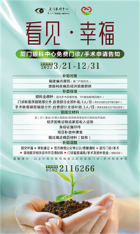 眼睛是心靈之窗,眼健康是國(guó)民健康的重要組成部分,也是反映人民群眾健康和幸福指標(biāo)的一面鏡子。為深化落實(shí)“愛心廈門”行動(dòng)及內(nèi)涵,提升人民群眾的獲得感、幸福感、安全感,滿足普遍、多樣的眼健康需求,2022年3月21日至12月31日,廈門眼科中心暖心啟動(dòng)2022年“看見幸福”眼健康愛心公益項(xiàng)目,聚焦弱勢(shì)群體及重點(diǎn)眼病的困難救治,凡符合條件的患者均可申請(qǐng)專項(xiàng)愛心公益補(bǔ)助。