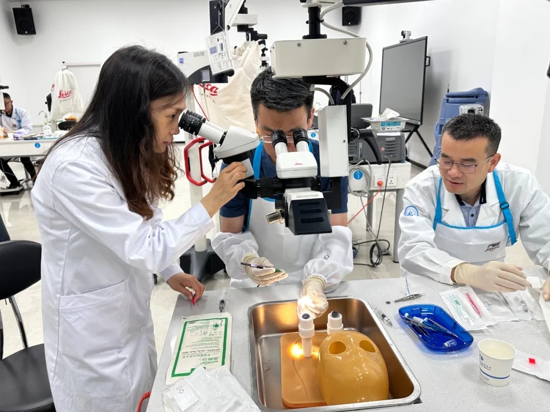 在Wetlab實(shí)操室,學(xué)員們?cè)趧⒉胚h(yuǎn)教授、鄭林主任、史小玲主任的示范與帶教下,體會(huì)每個(gè)手術(shù)分步的操作技巧。