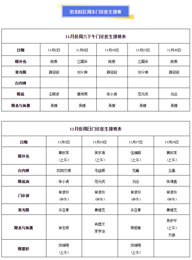 11月周末專家門診排班表如下