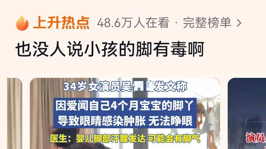 這兩天,一位34歲的女演員在社交平臺分享了一則自己的經(jīng)歷,她聞了自己四個月大的寶寶的腳丫后,眼睛竟然感染腫脹到睜不開。此消息一出,迅速登上熱搜,引發(fā)網(wǎng)友們熱議,該女演員也自嘲到:“也沒人跟我說小孩腳有毒啊。”